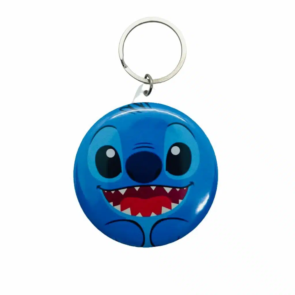 Chapita circular de 58mm. de ancho tipo llavero, posee un film transparente en la parte delantera para proteger la imagen, y en la parte trasera tiene un espejo para que la lleves a todos lados contigo, diseño de Stitch.