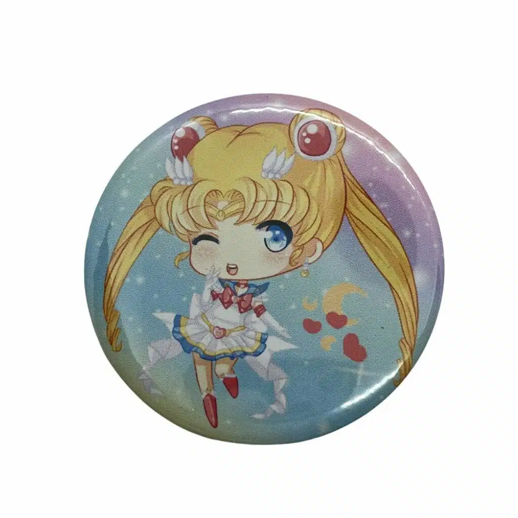Chapita circular de 58mm. de ancho, posee un film transparente en la parte delantera para proteger la imagen, y en la parte trasera tiene un gancho metálico para que la coloques y lleves donde tu quieras, diseño de personaje Serena de tu anime favorito Sailor Moon