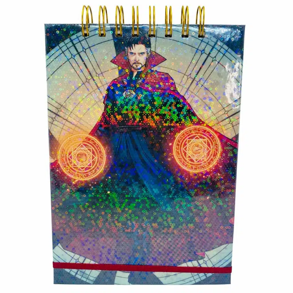 Croquera tapa dura con laminado holográfico de circulos, elástico y doble espiral metálico, tamaño A5 (14,8 x 21 cm), incluye 80 hojas blancas de 106gsm. Diseño de Doctor Strange – Avengers.