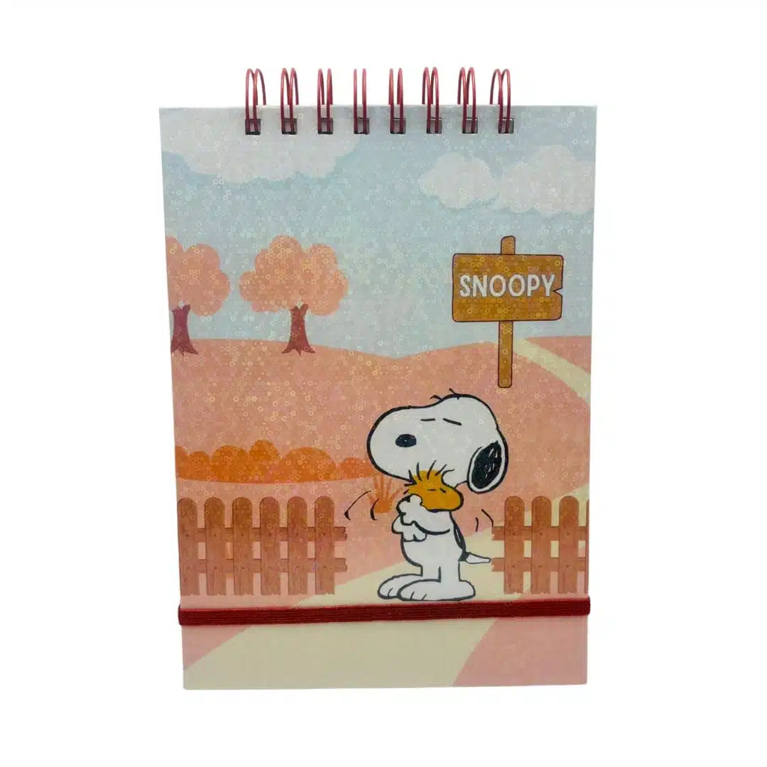 Croquera tapa dura con laminado holográfico de puntos, elástico y doble espiral metálico, tamaño A5 (14,8 x 21 cm), incluye 80 hojas blancas de 106gsm. Diseño de Snoopy.