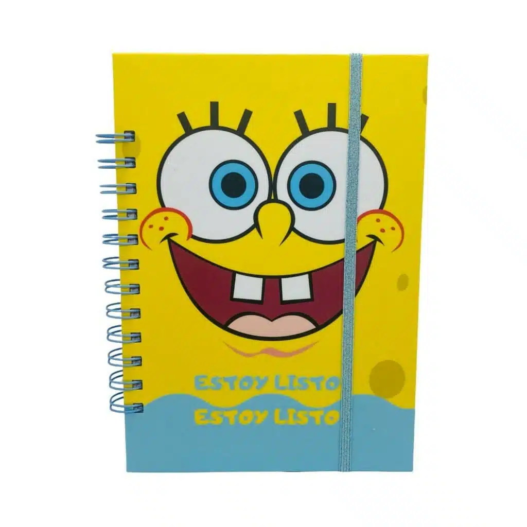 Cuaderno tapa dura con hermoso laminado mate en la portada delantera y trasera, elástico y doble espiral metálico, tamaño A5 (15cm x 21cm. aprox.), incluye 100 hojas de 106gsm. con diseño de hojas cuadriculado de 7mm, incluye página para datos personajes y un bolsillo para guardar hojas. modelo de tu dibujo animado preferido Bob Esponja.