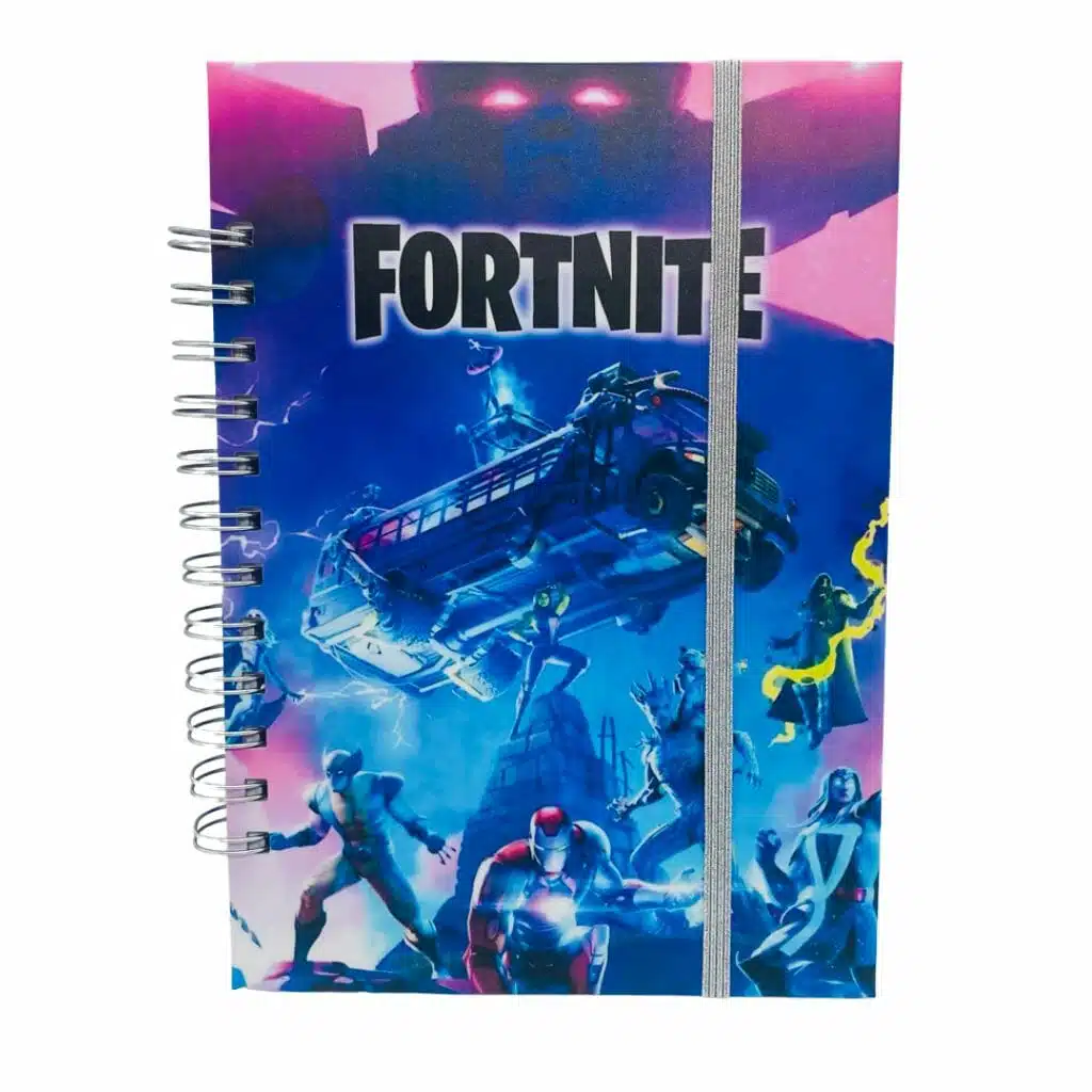 Cuaderno tapa dura con hermoso laminado mate en la portada delantera y trasera, elástico y doble espiral metálico, tamaño A5 (15cm x 21cm. aprox.), incluye 100 hojas de 106gsm. con diseño de hojas cuadriculado de 7mm, incluye página para datos personajes y un bolsillo para guardar hojas. modelo de tu videojuego favorito Fortnite.