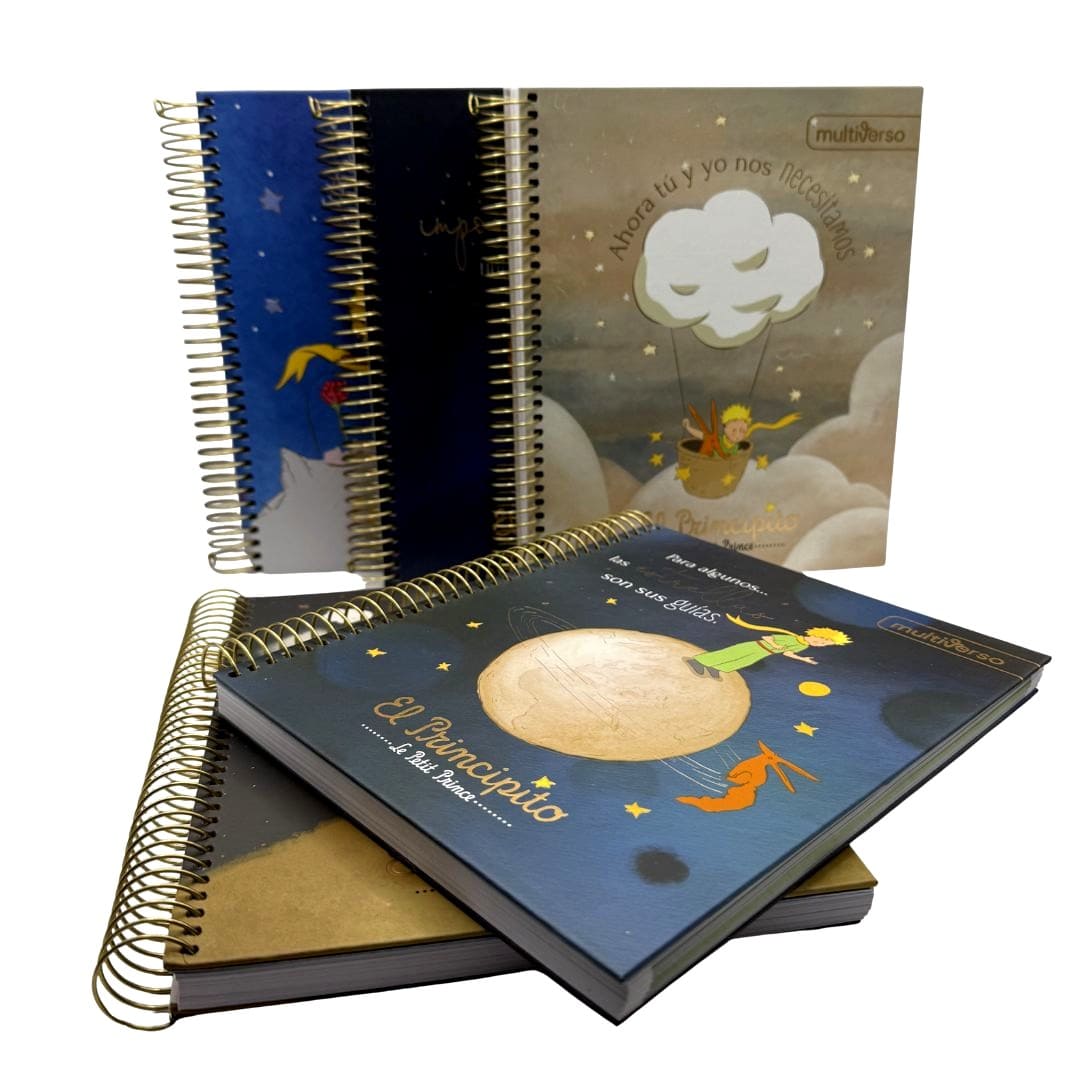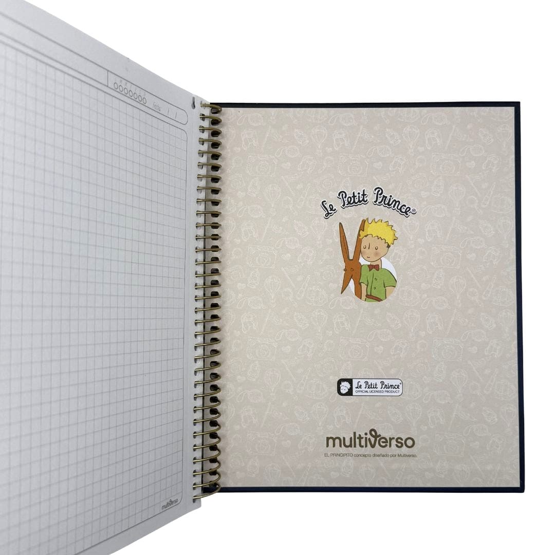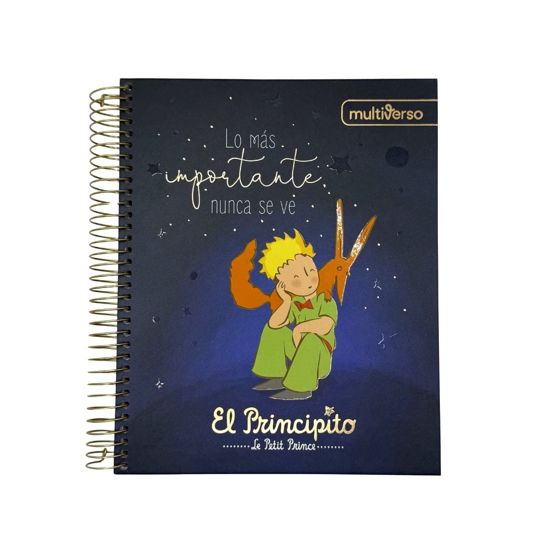 Hermoso cuaderno Multiverso en distintos diseños de El Principito para que elijas el que mas te guste, tapa dura mate con detalles brillantes, anillado metálico altamente resistente, posee 150 hojas cuadriculadas de 5mm. de 60 g/m2, es tamaño medio oficio (17 x 21,2cm.) Producto por unidad.