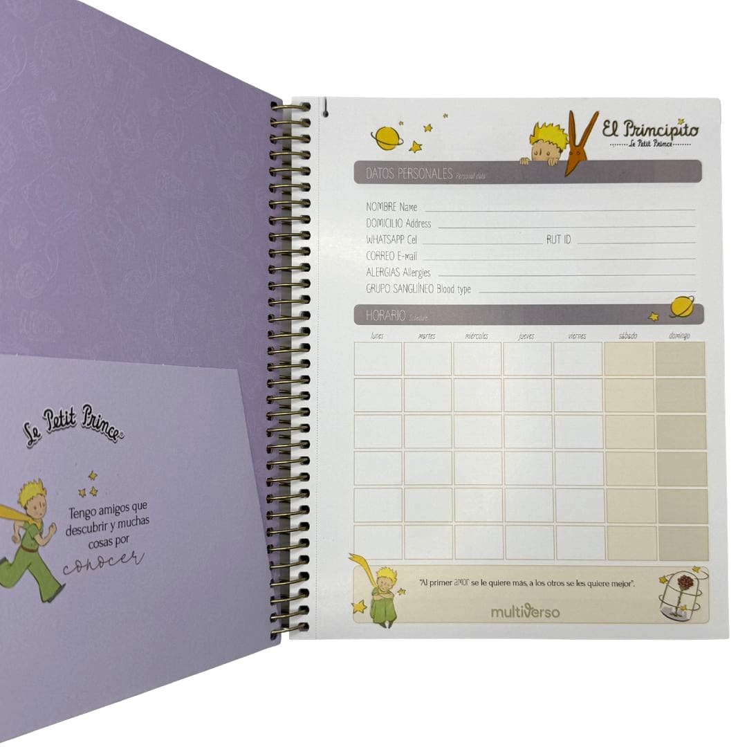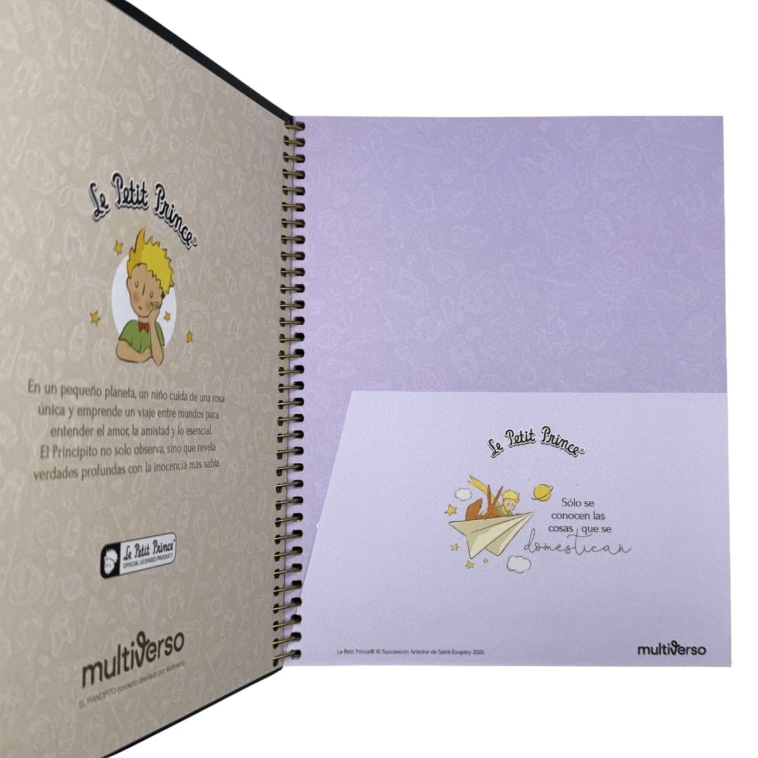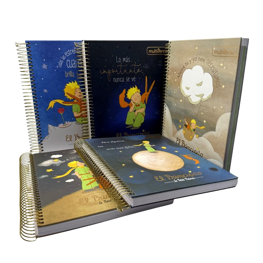 Hermoso cuaderno Multiverso en distintos diseños de El Principito para que elijas el que mas te guste, tapa dura mate con detalles brillantes, anillado metálico altamente resistente, posee 150 hojas cuadriculadas de 5mm. de 60 g/m2, es tamaño medio oficio (17 x 21,2cm.) Producto por unidad.
