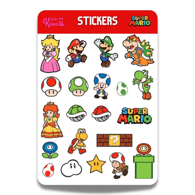 Lámina de stickers en acabado brillante de excelente calidad, mide 17cm. de largo por 12cm. de ancho aprox. incluye distintos diseños de Super Mario Bros, utilízalos donde quieras!