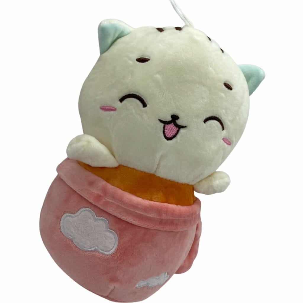 Peluche de gatito dentro de una macera color rosado, mide 22cm. de alto aprox. material poliéster