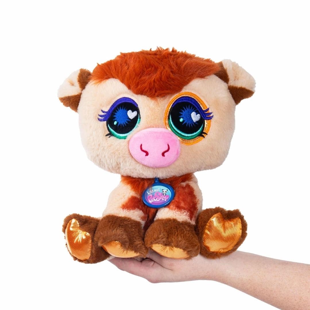 ¡Conoce a la vaca más adorable del prado! El peluche de 25 cm de la Vaca de las Tierras Altas de Littlest Pet Shop da vida al encanto de la granja y a la diversión esponjosa. Con un dulce hocico rosa, pelo naranja despeinado y un suave pelaje marrón y crema, este peluche está hecho de tela de pelo largo que es tan acogedor como parece. Los ojos bordados le añaden brillo y personalidad, mientras que el icónico collar LPS lo convierte en la elección perfecta tanto para fans como para coleccionistas. Desde aventuras en la sala de juegos hasta abrazos a la hora de dormir, esta vaca de las Tierras Altas está lista para ser la próxima compañera fiel de tu hijo. Ya sea que estés regalando o ampliando tu equipo de Littlest Pet Shop, este peluche rebosa personalidad y estilo. Colecciona los 3 estilos para añadir a tu equipo. Creado para abrazar, lleno de corazón y hecho para niños y coleccionistas de 4 años en adelante.