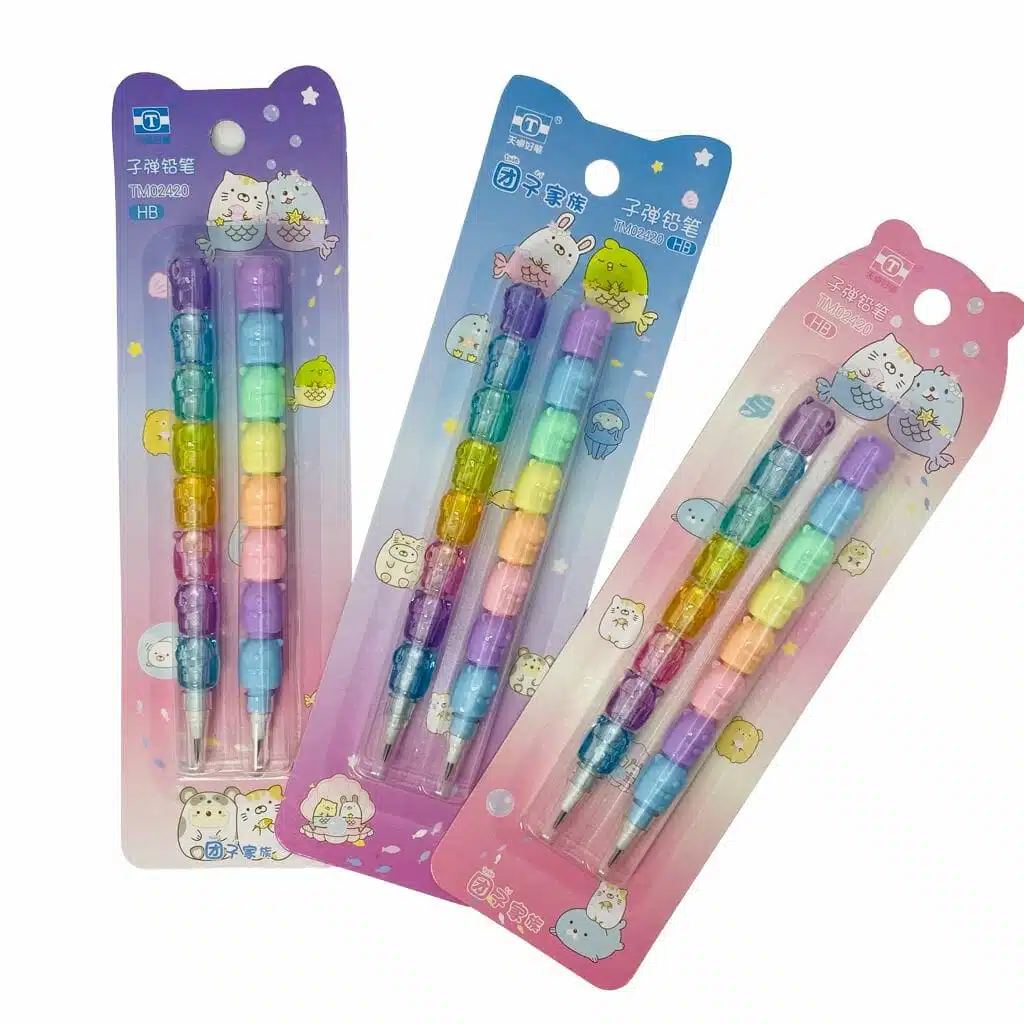 Set de 2 lápices grafito, dureza del grafito HB, las puntas son intercambiables apilándose unas con otras y desechables cuando se gastan, diseño de hamster de colores y transparentes, distintos colores de envase para elegir, producto por set