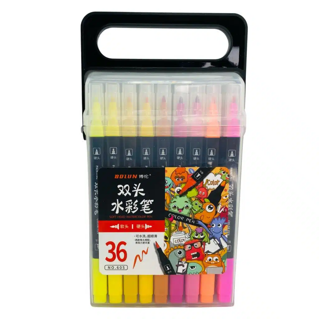 Set de 36 marcadores permanentes, distintos colores con doble punta (redonda y punta pincel) incluye estuche plástico para transportarlos, tinta al agua, no tóxicos.