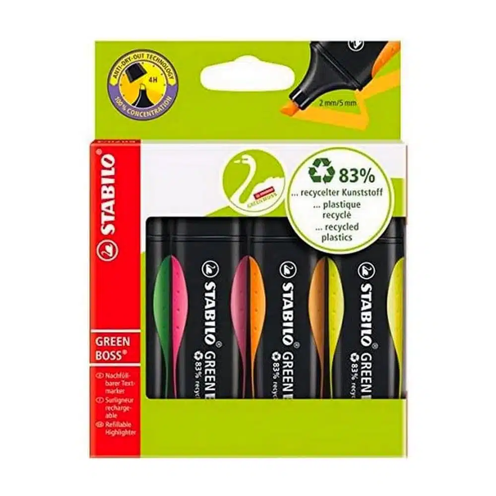 Este fluorescente STABILO combina la alta calidad con la sostenibilidad y es la elección perfecta para quienes tienen consciencia ecológica. Hecho con un 83% de platico reciclado para conservar los recursos naturales y reducir los desechos, es además recargable con las recargas del STABILO BOSS ORIGINAL. Ideal para largos periodos de uso gracias a su tecnología anti secado y disponible en 4 colores brillantes.