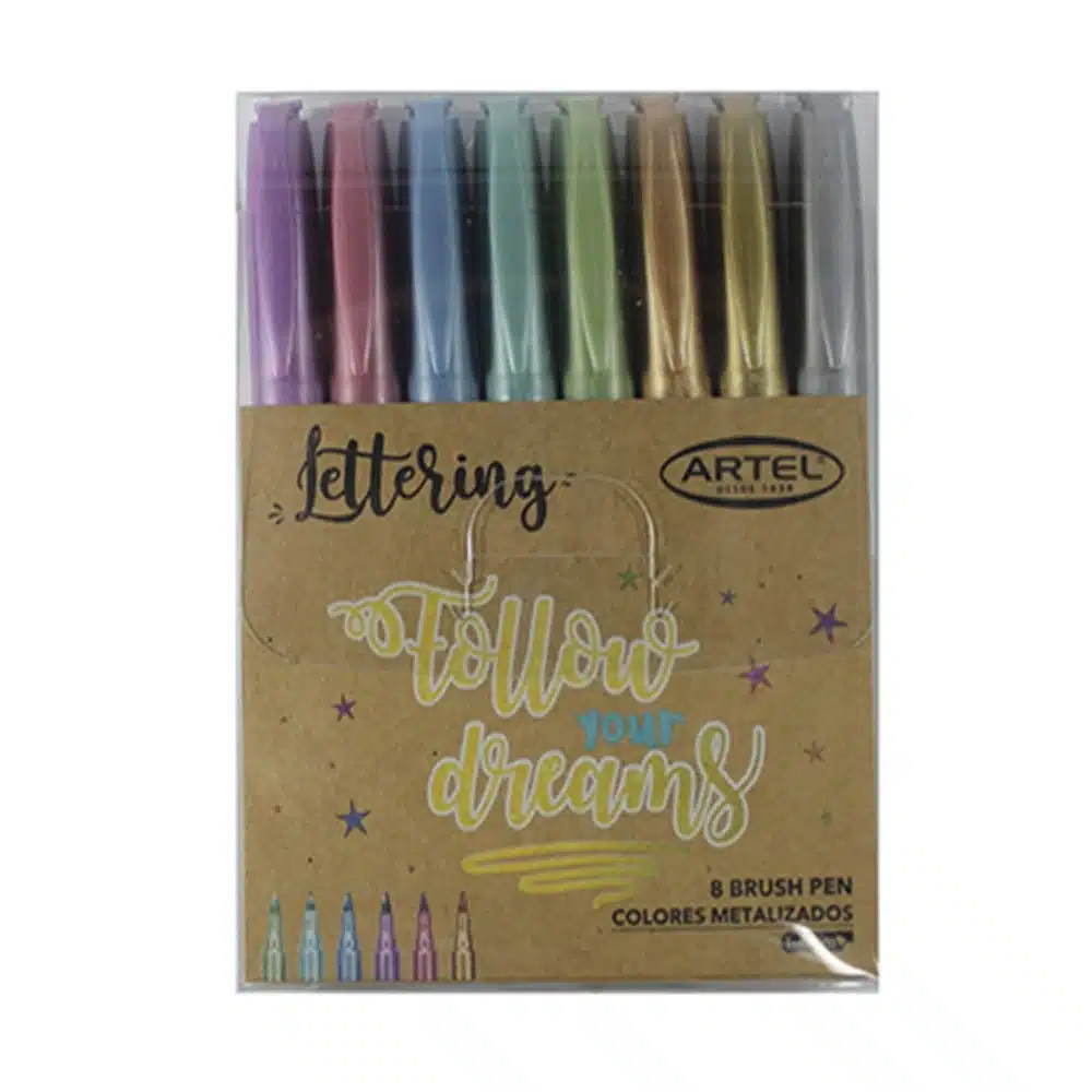 Set de 8 Lápices Punta Pincel Artel con tonalidad metalizada en 8 distintos colores ideales para Lettering, trazo de 1-4mm.