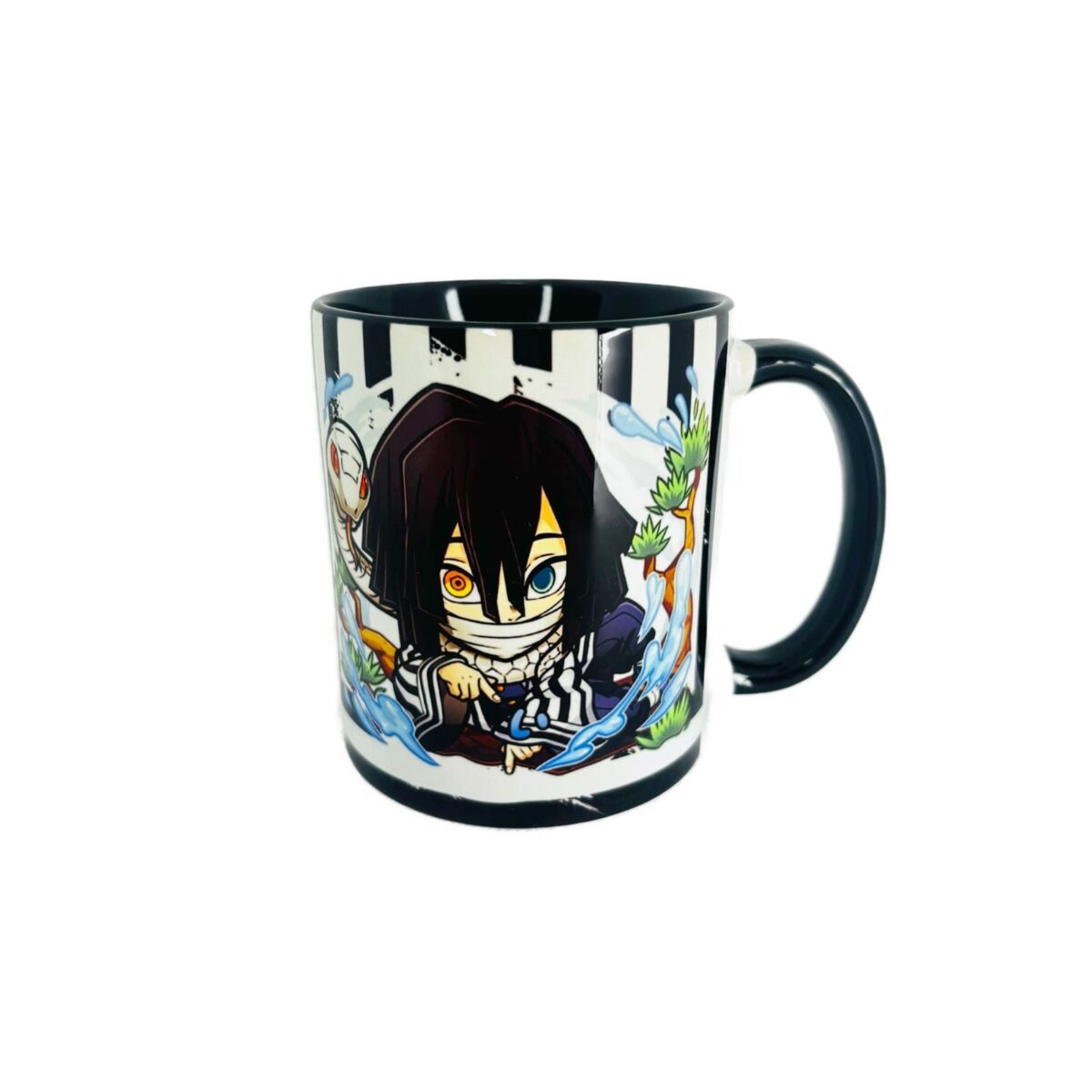 Tazón de 11 onzas (325ml de capacidad), tamaño 9,4cm. alto x 8,1cm. de diámetro. tipo premium de cerámica con mango e interior de color negro con un bello diseño de Obanai Iguro de la colección Demon Slayer: Kimetsu no Yaiba. Incluye caja individual.