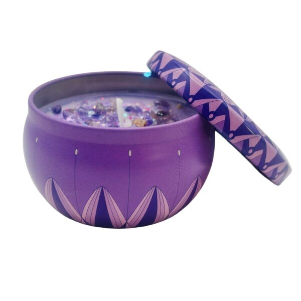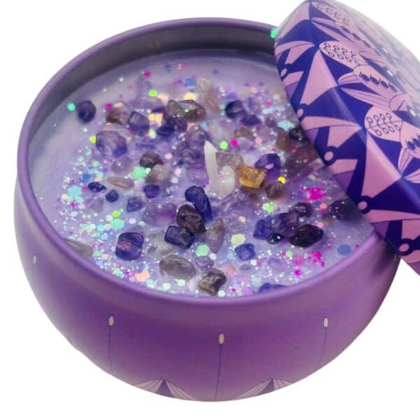 Vela 100% cera de soja en color celeste con aroma a esencia marina, viene en un hermoso envase metálico con tapa, incluye conchitas y glitter en su superficie, mide 6cm. de ancho por 4cm. de alto aprox. Producto por unidad.